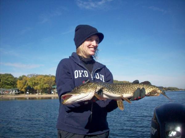 Image description: Andi with a nice pike from West O. She lost a muskie the day before she landed this fish. | Last modified: November 02 2013 11:27:09 |