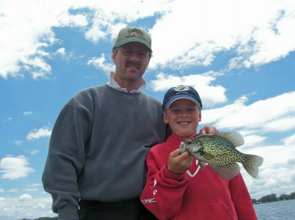 Image description: This picture captures the true meaning of getting out on the water with your kids.Good friend Scott "Spackler" Cabalka with son Austin with a West Okooji crappie.