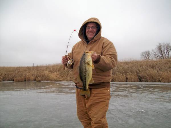 Image description: Paul and I on very early ice late November on local farm pond. Super nice bass-and even better when you get it through the ice.