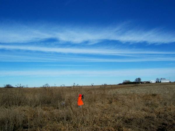 Image description: Aus shooting at a rooster flying directly away from him.Deke is on point on his left side. | Last modified: March 27 2011 16:57:48 |